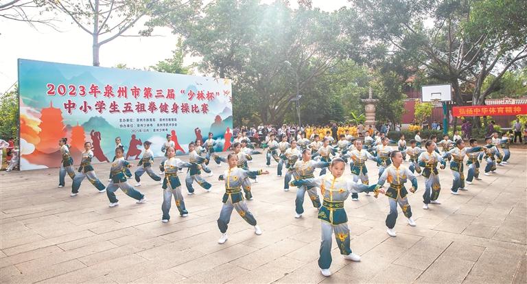 10月28日,泉州市第三届“少林杯”中小学生五祖拳健身操比赛在泉州少林寺举行,共有17支小学、9支初中、9支高中(中职)代表队参赛。