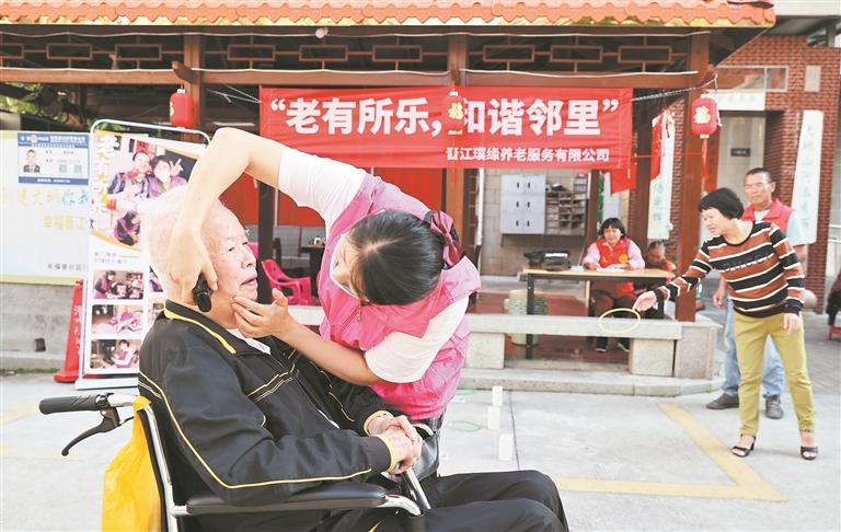 10月30日下午3点多,在晋江青阳街道永福里社区居家养老服务中心附近,一场以“老有所乐,和谐邻里”为主题的关爱老人活动正在进行,来自晋江璞缘养老服务有限公司的专业护理员李春丽为84岁的丁老伯刮完胡子后,丁老伯笑得很开心。