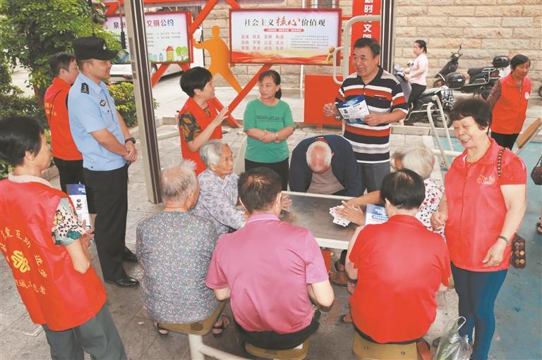 本报讯 (记者王丽虹 通讯员李淑媚 郑雅萍 文/图)“现在新的诈骗手段可多了,务必要小心……”近日,鲤城公安分局海滨派出所联合海滨街道金山社区“夕阳红”巡逻队,在辖区大街小巷宣传防范电信诈骗常识,平均年龄70多岁的退休老人们发挥余热,积极帮忙宣传反诈。