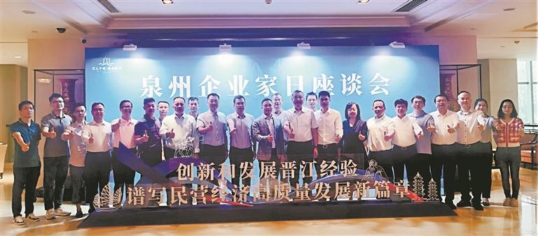 昨日上午,市工商联(总商会)系统工作人员早早来到座谈会现场参与协调工作。市工商联(总商会)主席(会长)周少雄也提前到达现场接受采访。图为周少雄与市工商联系统的相关负责人及工作人员一起为“泉州企业家日”点赞。