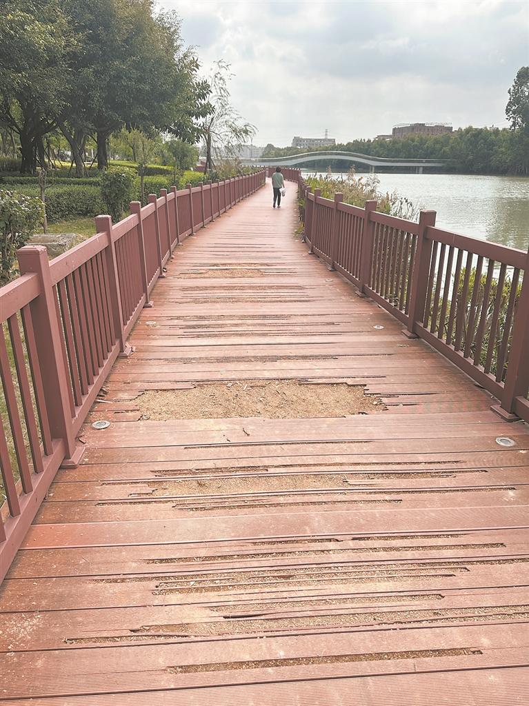 记者走访了陈先生所说的滨河公园。从公园北门进入园区,沿着木栈道往前走,每走几米,就能看到有木栈道破损或者缺失,有的是两块木板之间有一条或狭长或粗短的缝隙,有的则是两三块木板缺失,沙石裸露。走在木栈道上,有时候会被这些缝隙绊倒。如果市民夜晚来到此处,由于灯光比较暗,比较不容易看清这些破损的地方,更容易被绊倒。