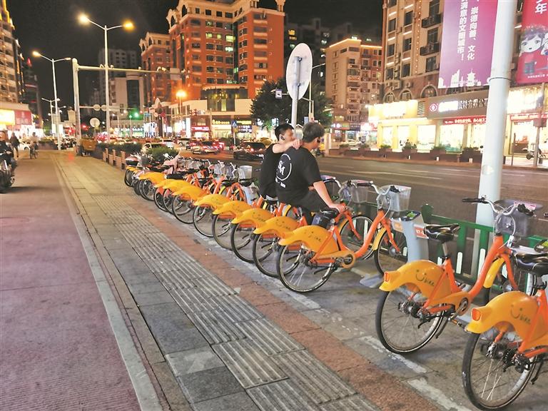 右图:泉州市区津淮街金帝文化广场“小黄人”站点,两名男子坐在靠桩的“小黄人”上面闲聊。这种行为不仅影响他人正常租借车辆,而且对车辆本身也会造成损坏。(网友“远宝” 摄)