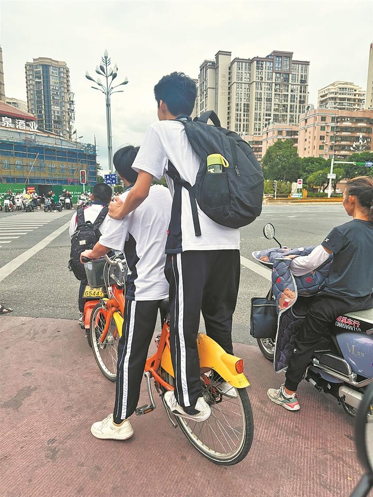 左图:泉州市区刺桐路津淮街路口,两名学生如此骑“小黄人”,不仅很危险,而且对道路安全构成危害,实在不应该。(网友“小满” 摄)