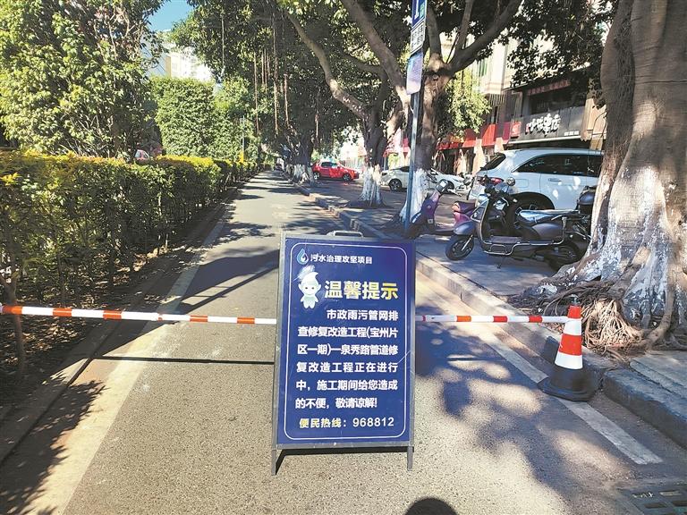 泉秀街非机动车道上也有一块告示牌,上面写着:“市政雨污管网排查修复改造工程(宝洲片区一期)—泉秀街管道修复改造工程正在进行中,在此期间,施工方提醒沿线来往车辆注意绕行。”