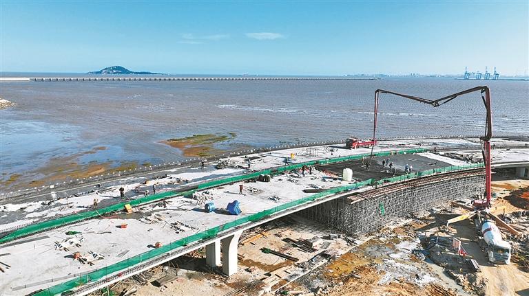 近日,随着最后一车混凝土的浇筑,泉州海湾大道项目秀涂互通段重要节点——南北高架桥桥梁顺利合龙。秀涂互通立交项目包含海湾大道方向约2.5公里,南北大道方向约1公里,其中南北大道高架桥全长517米。秀涂互通段预计今年年底通车,海湾大道预计明年4月份全线通车。(陈凤阳 陈桂生 摄)
