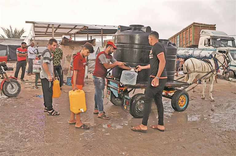 11月1日,流离失所的人们在加沙地带南部城市汗尤尼斯的一处临时难民营地取水。加沙地带人口大约230万,超过一半已逃离家园。(新华)