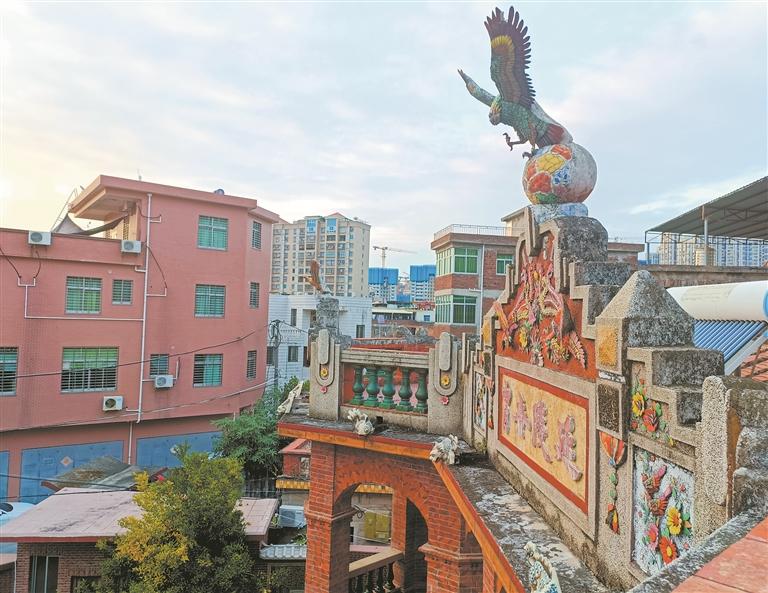 楼的正中山头顶端装饰一只站在彩球上的瓷片雕老鹰,一副雄风傲骨的姿态,表达振翅高翔之意;左右双楼的山头则有瓷片剪粘的大雁,寓意雁归南国、恋国爱乡。正中有匾“延陵世胄”,暗指家族源自延陵吴氏,上饰双凤,并标明建房时间;两侧山头则书有“明月台”“清风楼”字样,寓指故园环境幽雅,引人思乡。