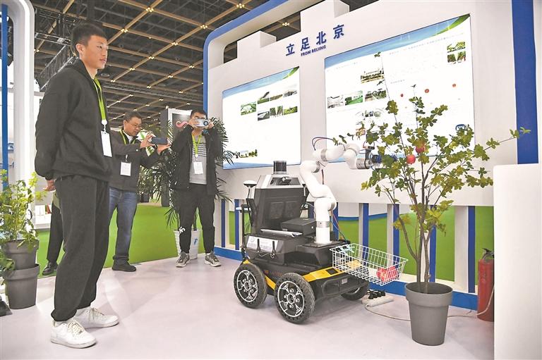 2023世界农业科技创新大会11月2日至4日在北京举行。本届大会以“粮食安全与未来农业”为主题,设置有主论坛、多场专题论坛和平行论坛以及世界农业科技博览会。图为世界农业科技博览会现场的一款智能采摘机器人。