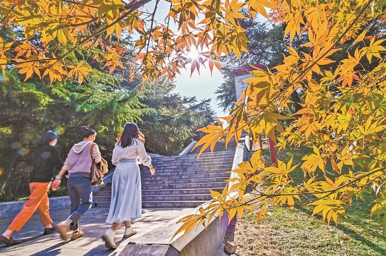 11月1日,穿着秋装的游客在山东省青州市范公亭公园赏景游玩。 (新华)
