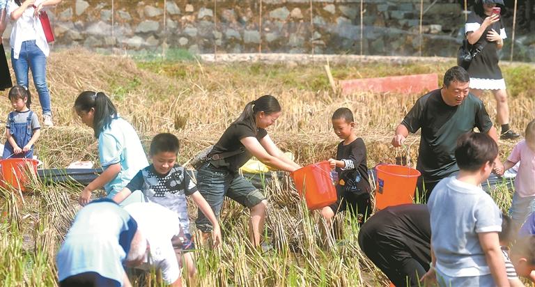 “我抓到了,我抓到了”,在一片稻鱼共生的水田中,10位“新时代好少年”跟着家长卷着裤脚、踩着泥巴,低头寻找“狡猾”的黄金鲫鱼,突然一声欢呼声响起,众人既羡慕又大受鼓舞,睁大眼睛继续跟鲫鱼斗智斗勇,溅得满身泥巴也不在意。很快,一条条黄金鲫鱼在一声声欢呼中应声入桶。田埂上,协办活动的泉州市摄影家协会摄影师按动快门,记录下一个个喜悦瞬间。20分钟的比赛结束,洪雅文和洪礼宗家庭队捉得4.75公斤鲫鱼,以50克的优势夺冠,收获了4袋稻米,当晚的鱼米晚餐食材齐了。
