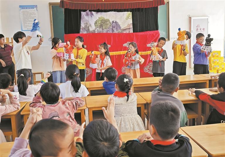 近日,为了传承和弘扬非物质文化遗产,南安市翔云镇联合南安市文化馆、石井菊江布袋戏剧团走进南安市翔云中心小学,让非物质文化遗产——布袋木偶戏的魅力丰富校园生活,让学生近距离感受非遗文化的魅力。课程从孩子们的兴趣点切入,讲解“木偶的秘密”,并介绍手法和操作技巧,邀请同学们上台亲自体验木偶戏的魅力,同学们化身木偶小能手,置身表演中,“玩”得不亦乐乎。(柯琳琳 黄耿煌 摄)