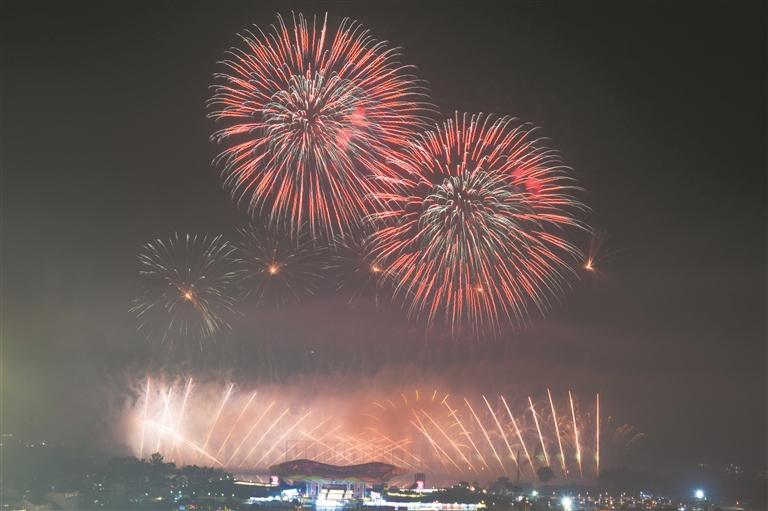 11月4日晚,2023年焰火大会(LFC)在湖南浏阳天空剧院拉开序幕。从全球范围内遴选出的中国、意大利、德国、瑞士四支顶级焰火燃放队伍,齐聚浏阳河畔展示烟花产品新的燃放编排创意和表演形式。图为德国代表队燃放焰火亮相夜空。 (中新)