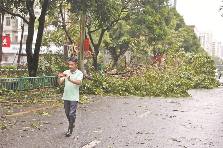 8时30分,沿海大通道两侧的行道树被狂风吹得东倒西歪,车子不得不拐来拐去,转得人犯晕。一路风雨交加,记者打开一点车窗拍照,雨水立即狂灌进车内。临近9时,前往目的地的路都出现了严重积水,车子一再调头、改道,眼看台风越来越近,大家都焦急了起来。