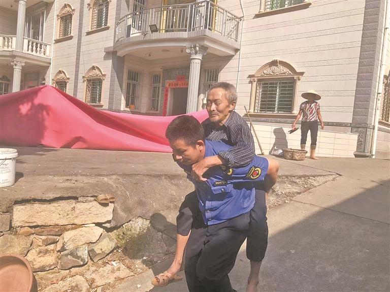 陈辅锦背着老人,将其送回家。(受访者供图)