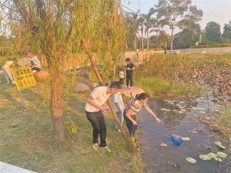 5日16时许,记者来到笋江公园,园内笋江湖的每一处湖域,几乎都可看到游客在捞鱼。他们将抄网伸到湖里,再将捞起的鱼放到提前准备好的桶里。这些捞鱼的游客多为一家人一起上阵,有时是大人和小孩一起捞,有时则是孩子自己捞。在一些湖域,有孩子趁大人不注意或站在岸边的大石头上侧着身子捞,或拨开岸边的杂草和芦苇直接踏进湖里。