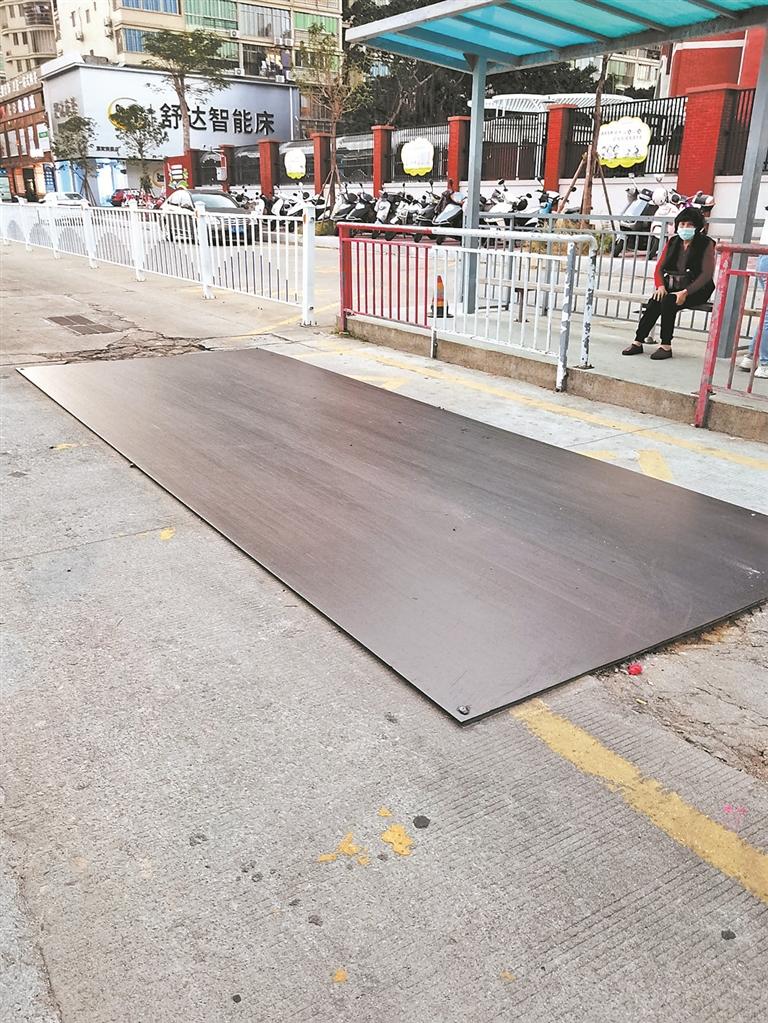 本报讯 (记者柯丽娟 文/图)“惠安县螺城镇建设路原客运南站公交站点前面,有一处破损的路面被铁皮盖住,公交车经过时会发出很大的声响,影响周边住户休息。”在昨日的“总编接线”期间,网友“小超”向@96339记者热线反映。