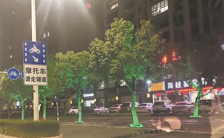 本报讯 (记者石伟琴 文/图)在“总编接线”期间,网友“晴天”向@96339记者热线反映,晋江市池店镇江滨南路上有几棵绿化树因被绿灯照射变成了绿色的树。他想了解,这是部门设置的还是商家行为,这种做法是否会对树木造成伤害。