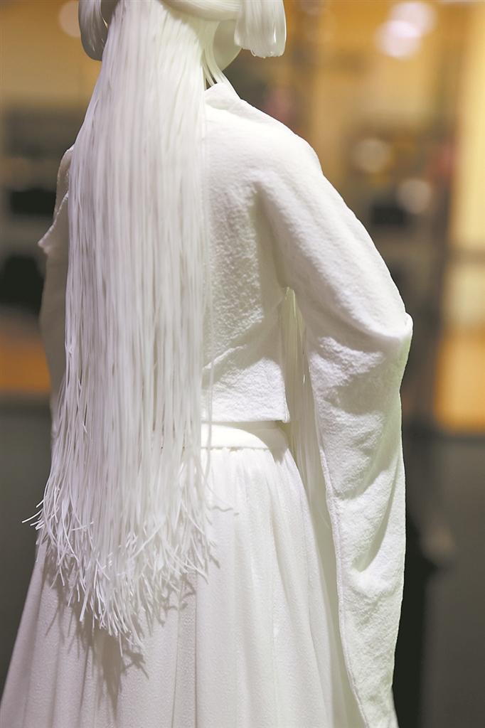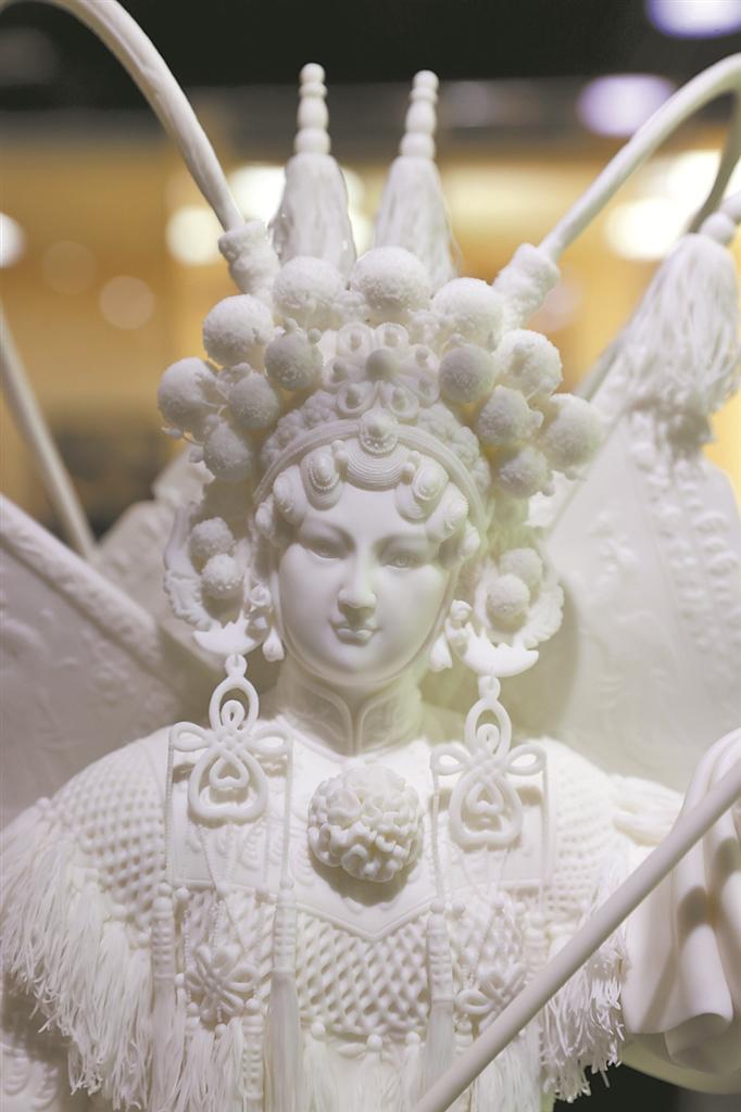 要说此次展览上最“出圈”的展品,非白瓷雕塑《神话》莫属。作品表现的是成龙、金喜善等主演的电影《神话》里遗世独立的玉漱公主。发丝芊芊,素白的衣袍飘逸如风,似纱却非纱,精妙绝伦,令众多游客发出“远看是纱,近看是瓷”的惊叹。