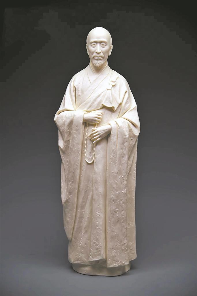 除此之外,庄少卿创作的弘一法师瓷塑作品《明月入怀》也入展品行列。为求将弘一法师了解得全面而透彻,他们花了很长时间去思索和收集资料,仔细研读弘一法师的生平事迹,观察研究弘一法师的图像,参考观摩各种材质的弘一法师造像。作品中弘一法师目视前方,手握一串佛珠于胸前,法衣宽腰阔袖,重磅下垂,端庄严整又自在无碍。
