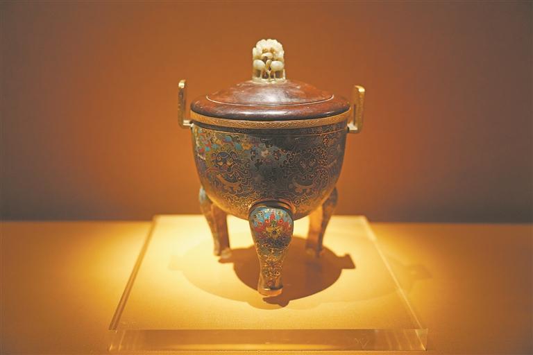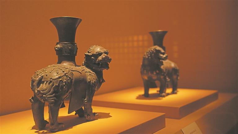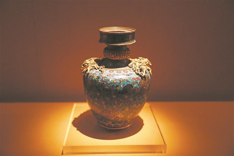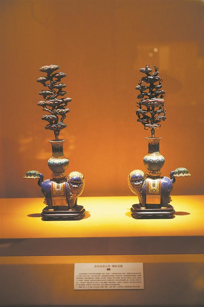 展览中,明代景泰款掐丝珐琅狮戏球纹蟠龙藏草瓶、明晚期景泰款掐丝珐琅狮戏球纹蟠龙象足炉、清代铜错银鎏金狮式尊、清代掐丝珐琅五供—狮驮花瓶等文物特别引人注目。