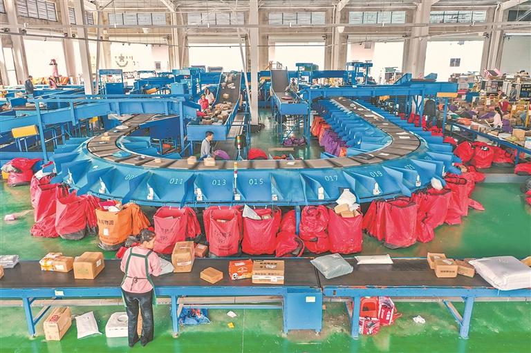 在湖南省永州市蓝山县创品国际智慧物流园,工作人员在智能分拣作业线上忙碌。(新华)
