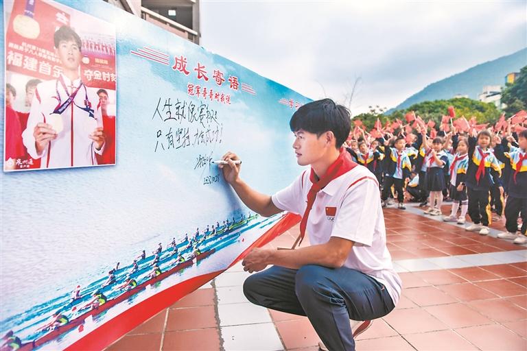近日,荣获杭州第19届亚运会福建首枚金牌的永春健儿陈弦峰走进母校岵山中心小学和永春县实验小学,与师生面对面交谈,分享自己的成长经历,传递拼搏向上的体育精神。图为陈弦峰在留言板上写下“人生就像赛艇,只有坚持,才会成功”的寄语。(陈志鹏 林艺华 摄)