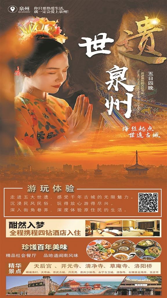 线路简介:感悟泉州世遗文化、了解千年海丝故事,线路融合了泉州的非遗体验、民俗观光、网红打卡、烟火气息等特色元素,让游客在泉州多元文化的交相辉映下、原真闽南的深度体验后,读懂泉州、爱上泉州。