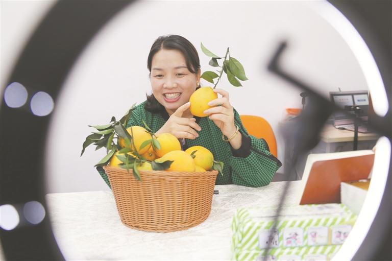 11月11日,在湖南省永州市道县道滋味有限责任公司,主播在网络平台上推广当地脐橙。( 新华)