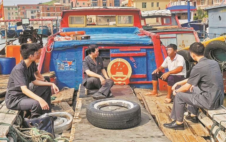 近年来,泉港法院始终坚持和发展新时代“枫桥经验”,立足沿海地域优势和产业优势,聚焦诉源治理工作,持续在纠纷预防、矛盾化解、诉源治理上下更大功夫。图为在南埔镇惠屿岛渔船上,法官们向渔民介绍渔业生产、海洋保护的法律知识和非法捕捞的法律责任等,引导渔民共同保护海洋资源及海洋生态环境。 (林弘梫 林长鑫 摄)