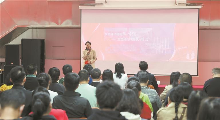 泉州市发展和改革委员会的宣讲员刘莹婷在《推动泉州民营经济由“大”到“强” 勇担新时代民营经济强省战略主力军》的宣讲中讲述,泉州举全市之力,大胆探索、改革创新,积极谋划发展民营经济新的实招硬招,明确要在建设高水平创新型城市、建设现代化产业体系、建设一流营商环境、构建亲清统一政商关系、优化民营企业高效平等获取资源要素政策中走前头、作表率,力争再创“晋江经验”新辉煌。