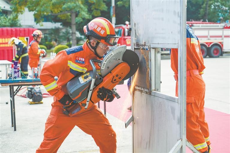 近日,惠安县2023年消防宣传月启动仪式在县体育馆举行。图为活动现场消防救援技能展示。(刘超峰 摄)