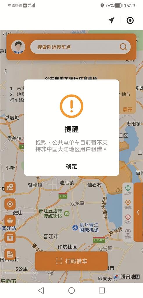 近日,在厦门居住的台胞曹先生致电本社24小时热线96339反映,几天前,他和朋友来泉州市区游玩时,本打算使用泉州公共电单车“小橙”畅游古城,未曾想,用微信小程序扫码借车时,却跳出了弹屏,上面显示:“公共电单车目前暂不支持非中国大陆地区用户租借”。