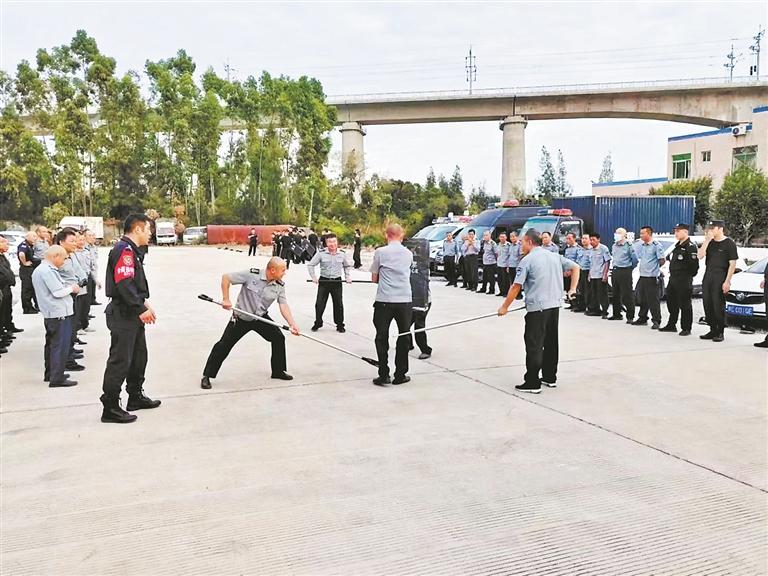近日,泉州台商投资区教育文体旅游局联合台商区公安分局、集英保安公司,在台商区巡特警大队组织开展学校保安员实操业务培训,进一步提升保安员业务技能和处置各类突发事件的应急能力。为提高成效,保安员分6期进行培训,总参训人员260余人,采取理论讲解和实操训练交叉方式,内容涵盖保安岗位职责、实操演练、队列队形训练和反恐防暴等方面。图为巡特警正指导保安员进行反恐反暴演练。 (罗剑生 陈忆先 摄)