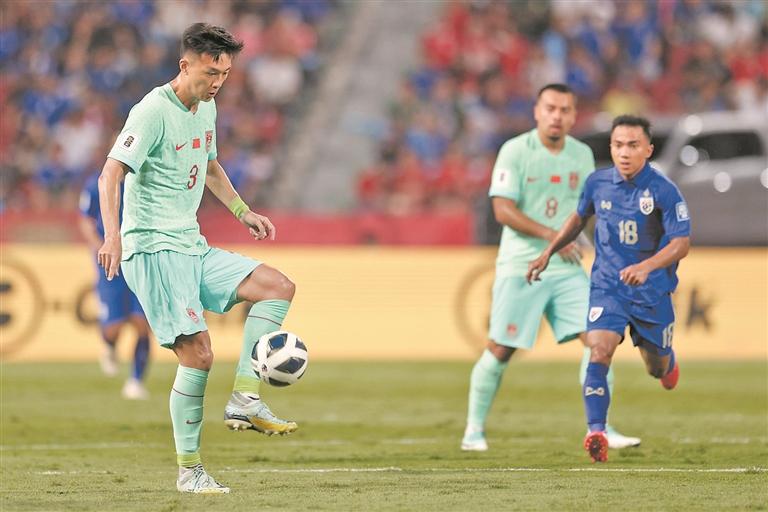 11月16日晚,在2026世界杯预选赛亚洲区36强赛首轮比赛中,凭借武磊和王上源的进球,中国队在客场以2∶1战胜泰国队,首战告捷。这是中国男足第13次开启冲击世界杯的征程。图为中国队球员在比赛中传球。(晚宗)