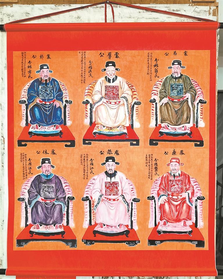 说起最近的这次圣帧临摹,故事同样颇为曲折。画家林建华说,六桂始祖因为是兄弟,长相差不多,只有眼睛和鼻子稍有区别。不过,闽南六桂宗亲总会最先提供给林建华临摹的圣帧非常模糊,五官都看不清楚,一时间难以落笔。冥冥之中,他们感觉在别的地方或有较清晰的圣帧。“后来我们想到一家广告公司曾经翻拍过六桂始祖圣帧。”闽南六桂宗亲总会总会长洪文化宗长说,当他们找到该广告公司时,原来的老板已经过世,老板的儿子翻找了很久才找到清晰版的六桂始祖圣帧图片。有了清晰版的圣帧图片,林建华决定主要采用叠彩画法,一层层加色,并融合国画画法,“先后易了六稿,才最终临摹完成六桂始祖圣帧”。