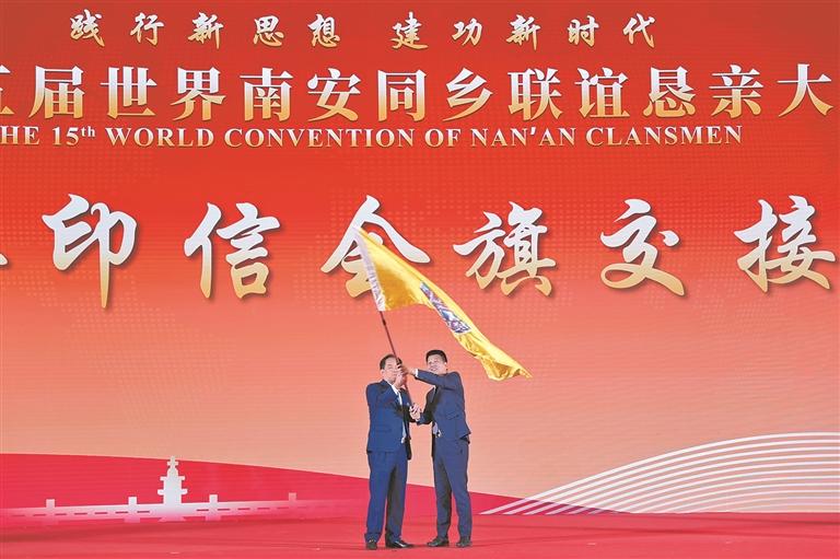 大会现场,举行了联会印信会旗交接仪式。南京南安商会会长、第十四届南安世联会主席杨煌购将印信会旗移交给第十五届南安世联会主席、南安市慈善总会会长、厦门市南安商会会长侯昌财,接力搭建推动聚侨赋能、南商回归的发展平台,培育新生力量、青蓝接力的传承平台,凝聚乡情乡谊、助力家乡发展的献力平台。