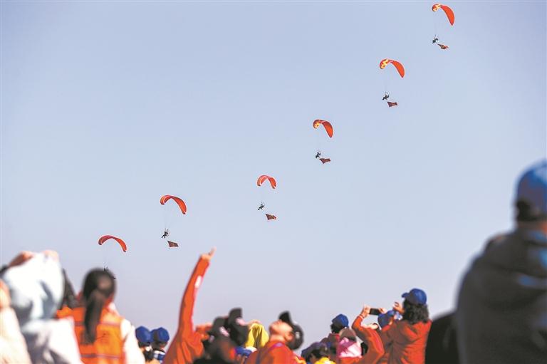 11月18日,2023年全国跳伞锦标赛在江西吉安县的桐坪飞行小镇开幕。本次比赛共设有11个竞赛项目,来自江西、北京、山西、四川等省份的7支代表队,近120名领队、教练和运动员参赛。图为开幕式上的动力伞表演吸引民众观看。 (中新)