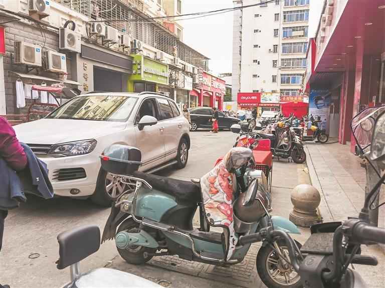 随后,记者来到位于泉秀街北侧的丰盛假日城堡小区,本就不宽的路面被一些停放的小车占去近半,有的小车直接停放在绿化带上,四处可见随意停放的电动车,有的还“见缝插针”塞在各个角落及小车之间。小区5号楼地下停车场出口的道路上有多家商铺,商铺门口停放着许多电动车,使得道路只容得下一辆轿车通行。记者看到该段路并未设置限速标识,行人只能小心翼翼地穿行。