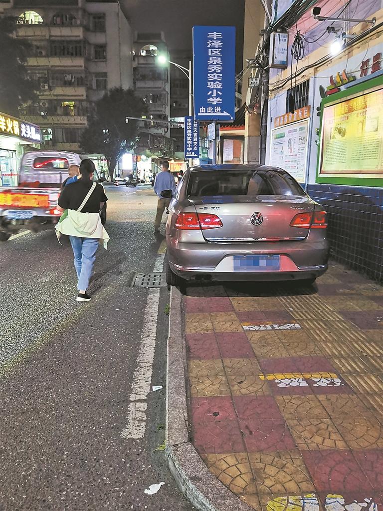 ?车辆违停在丰泽区浦西路泉秀实验小学路段的人行道上,导致行人只能行走在机动车道上,与车辆混行。
