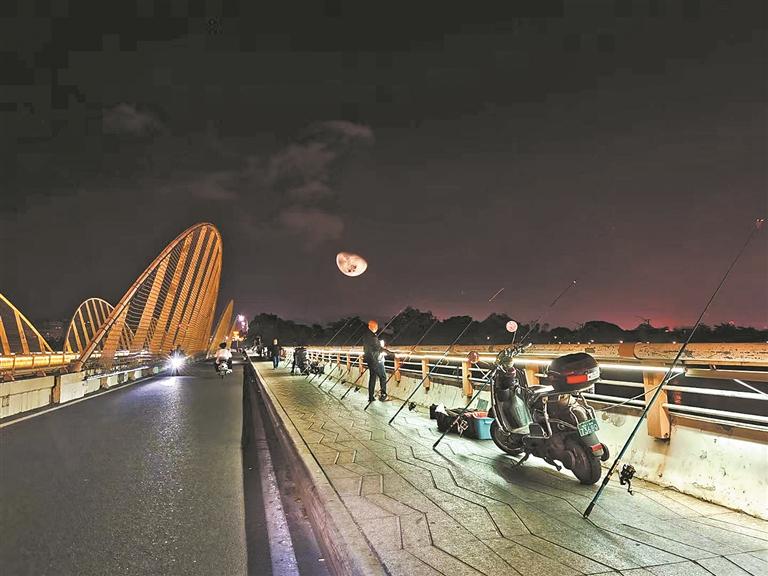 ▲每天晚上经过鲤城区笋江桥,都会看到很多人在桥上钓鱼,一排的鱼竿整整齐齐的有几十根。垂钓者把电动车停放在路边,占用了一半的非机动车道,给行人造成不便,也存在安全隐患。(刘女士 摄)