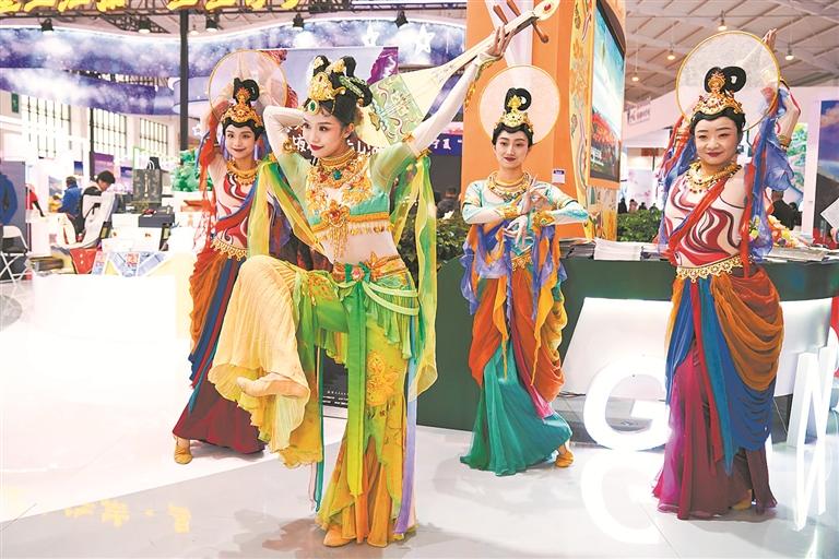 近日,在昆明举行的2023中国国际旅游交易会上,各参展商异彩纷呈的展示吸引民众前来观展。图为甘肃展台的精彩表演。