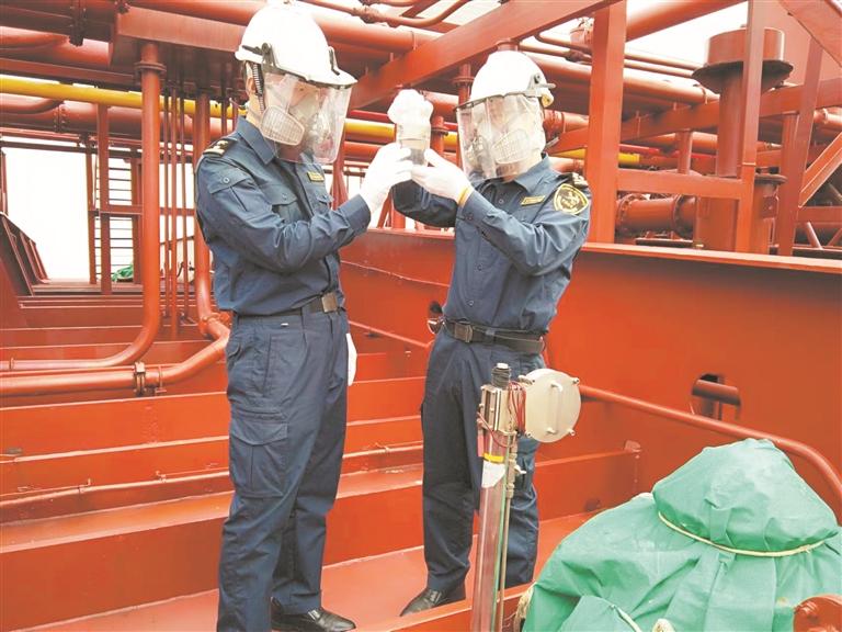 本报讯 (记者刘倩 通讯员王洋 王丹妮 罗德清 文/图)日前,满载3.5万吨石脑油的中国籍油船“长航发现”轮靠泊肖厝港区联合石化鲤鱼尾码头。船舶一靠妥,泉州海关驻泉港办事处关员第一时间登轮,开展检疫查验、取样送检等作业,不到两个小时,即为这批来自印度的石脑油办理放行手续,确保其最快时间可接臂卸货。