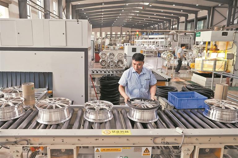 近年来,南安市大力发展实体经济,加速推进现代制造业的高端化、智能化步伐。图为南安市一装备企业的全自动生产线上,旋压机器人灵活运转,一个个轻量化铝合金汽车轮毂从材料到成型的制造过程行云流水,既节约了人力,又提升了产品质效。(陈晓东 摄影报道)