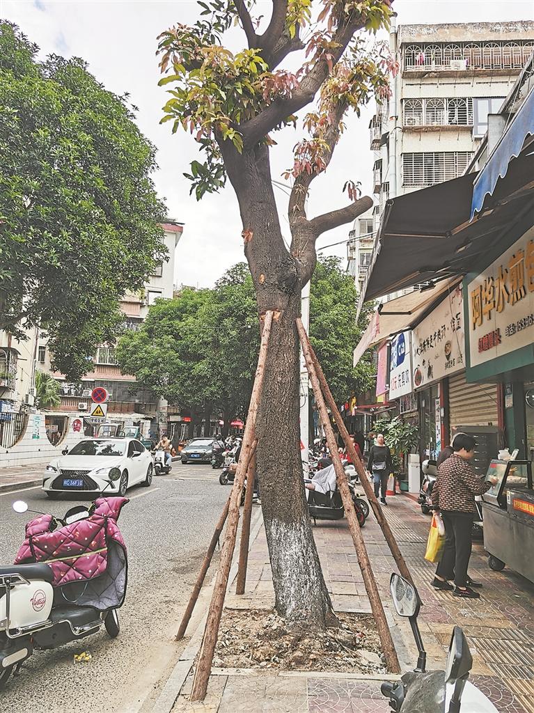在现场,记者看到,浦西路98号附近的行道树已被扶正,凸出地面的树根被砍掉,部分树枝已被修剪,树木四周用木架固定着,而树池四周也重新铺上了石条。除此之外,人行道上的方砖已重新铺设,道路恢复平整。