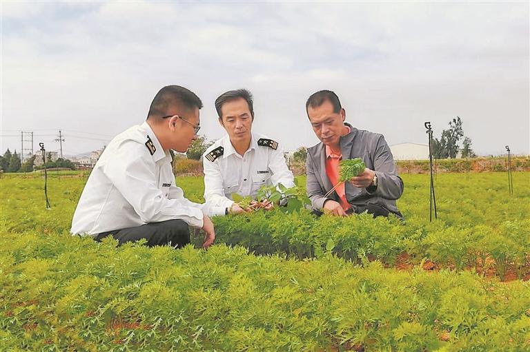 针对近年来国外严苛的法规标准要求,泉州海关积极推进基地标准化管理,指导企业以智能化手段实现对农业投入品、疫情疫病和有毒有害物质监测等方面管理,建立健全以土壤、水源监测、采收前原料监测为关键控制点的质量安全追溯体系,从源头上保障产品安全,助力泉州冬春胡萝卜走出国门,走向世界。图为海关工作人员日前对出口胡萝卜基地进行监管。(记者刘倩 通讯员王凤平 陈学辉 摄影报道)