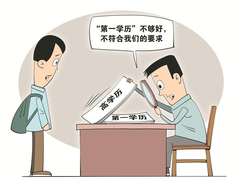 近日,有关“第一学历”的话题再次引发热议。教育部曾公开回复,国家教育行政部门相关政策及文件中没有“第一学历”这个概念,但在实际招聘中,把“第一学历”作为评价标准的现象依然存在。日前,中国青年报社社会调查中心联合问卷网发布的一项有1000名受访者参与的调查显示,55.1%的受访者认为这是高学历人才众多,竞争激烈的结果,45.8%的受访者觉得这是“一刀切”的选拔方式,超六成受访者认为需要破除求职中的“第一学历”评价标准。 (朱慧卿/图)