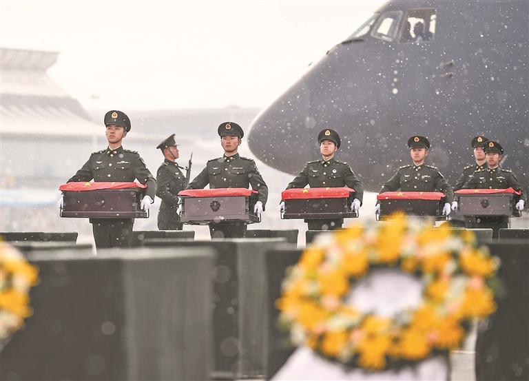11月23日,第十批在韩志愿军烈士遗骸由我国空军专机护送,从韩国接回辽宁沈阳,25位志愿军烈士英灵及相关遗物回到祖国怀抱。