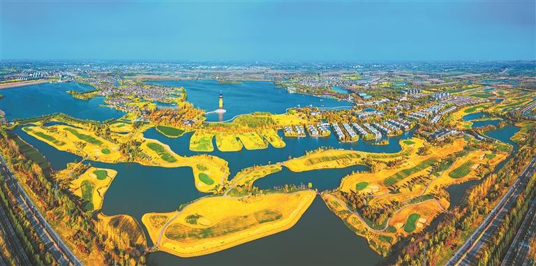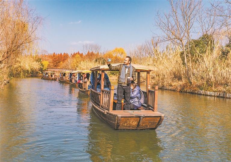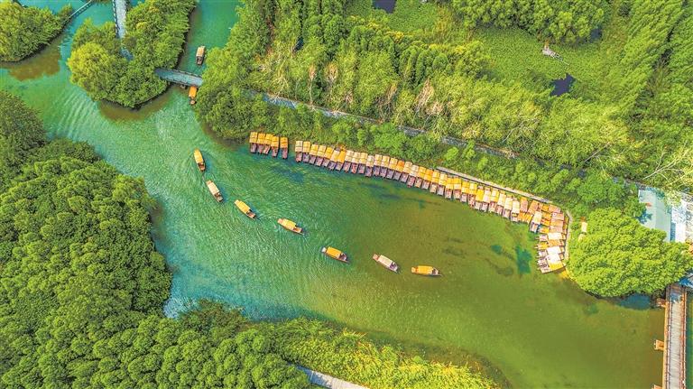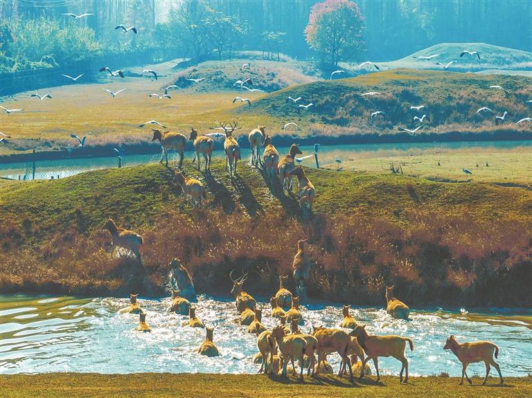 近年来,泰州市持续开展“健康长江泰州行动”,保护中华民族的母亲河不受污染,让自然生态环境展示新面貌。泰州积极践行“两山”理念,推动绿色高质量发展,让溱湖湿地成了文化旅游的“聚宝盆”。走进江堰区总面积26平方公里的溱湖国家湿地公园,97种鸟鸣声悦耳,21种兽穿行林间,23种爬行动物悠然散步,38种鱼和21种浮游生物畅游水间。在溱湖麋鹿养殖基地,头脸像马、角像鹿、颈像骆驼、尾像驴,俗称“四不像”的世界珍稀保护动物被从国外引种回国繁衍生息,上千头聚集在一起,或奔行于草地原野,或集体横渡水道,上演了一幅生态和谐的画面。