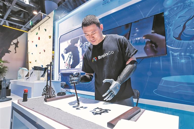 图为在博览会上拍摄的融合脑机接口技术与人工智能算法控制的新型仿生手。(新华)
