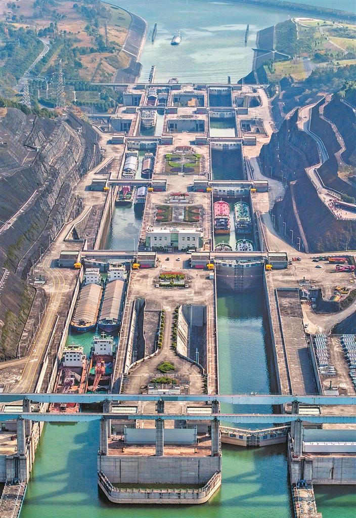 11月24日,记者从交通运输部获悉,截至23日18时,三峡枢纽航运通过量达1.6亿吨,已突破历年最高水平。其中三峡船闸运行10148闸次,通过量1.56亿吨;三峡升船机运行4187厢次,通过量437.89万吨。图为在湖北省宜昌市,船舶有序通过三峡双线五级船闸(无人机照片)。(新华)